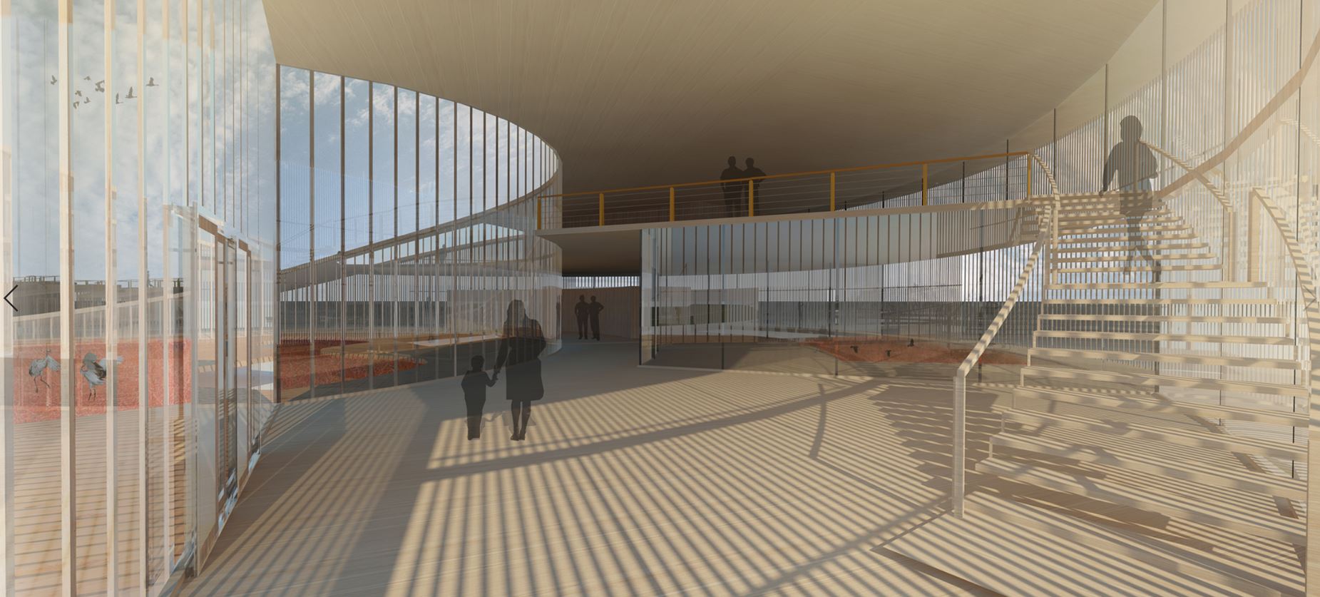 When tides up during the day and seasons, the outdoor viewing platform will be submerged, and the building changes as the same as a crescent. At this time, visitors cannot get on the platform. On the contrary, when the tide goes down, the outdoor viewing platform will be revealed with Suaeda, and the building returns to the prototype. Then, visitors can board on the platform and get closer interaction with birds.