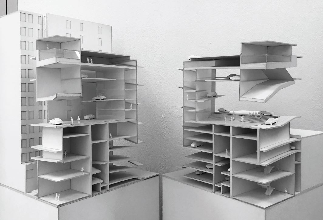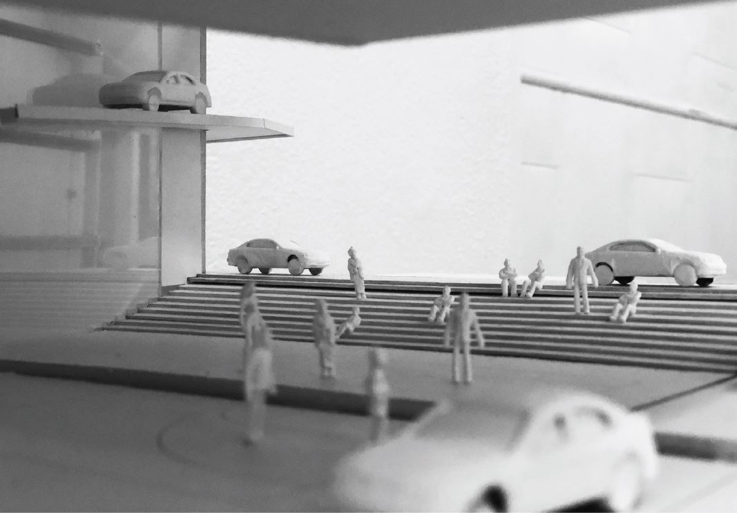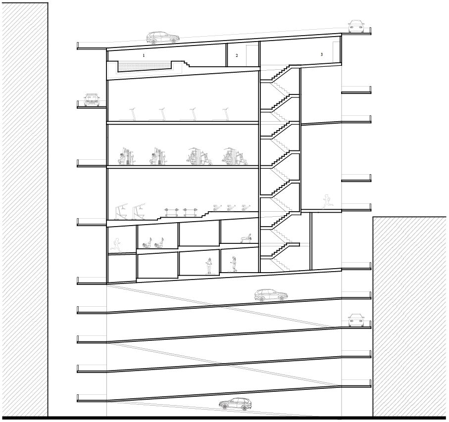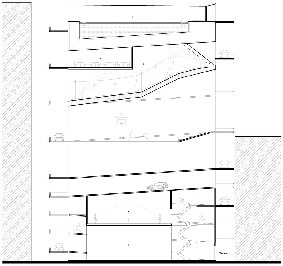 Another point is about how human circulation manipulates cars through the building. So the circulation organizes the building with those cantilevering ramps that are on the exterior of the building as a surface wraps the façade of the gym, so the ramps are eventually generating an enclosure as well.