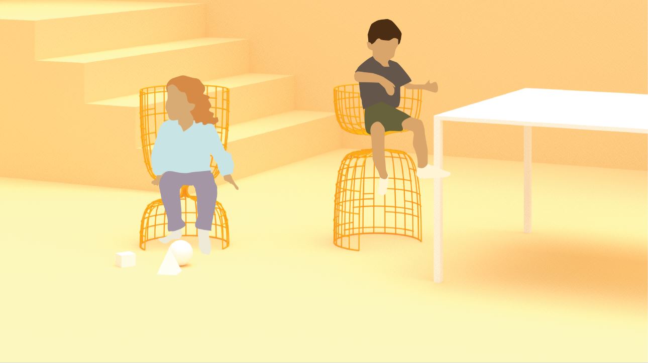 So the benefit of the chair is that people could choose their preferred gestures based on the height of the chair. For example, the lady is sitting in a lower position while the man is sitting higher.
